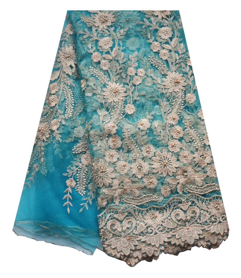 A dress with simple lines, flared skirt, a scoop neckline, and short puff sleeves made from this lace over a dark turquoise fabric.https://images-na.ssl-images-amazon.com/images/I/71p2mi8-PRL._SL1050_.jpg